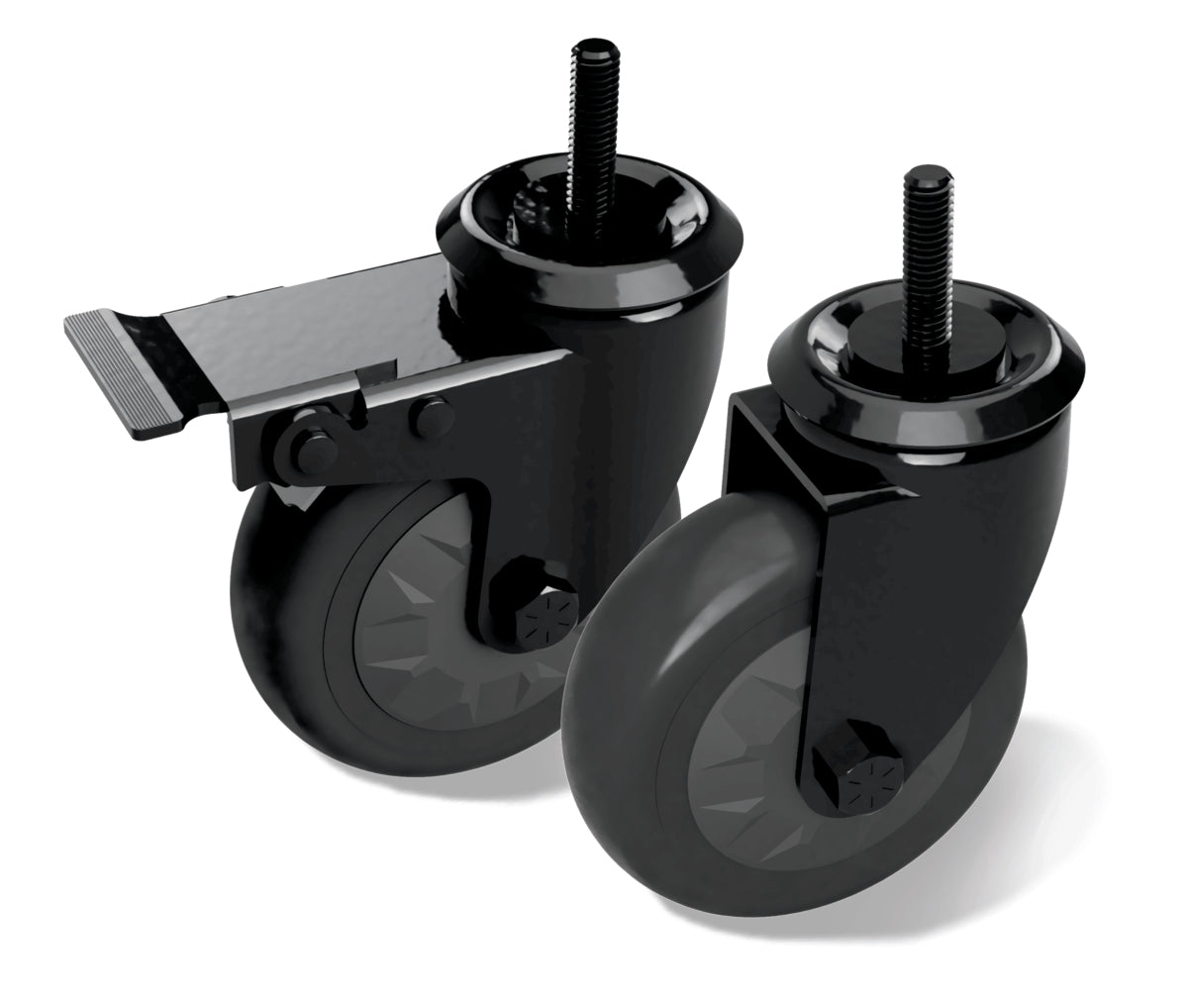 Dieses Set besteht aus zwei mattschwarzen Schwenkrollen (Locking Caster Kit) – von denen eine mit einer Bremse ausgestattet ist – und wurde speziell für Big Green Egg entworfen.