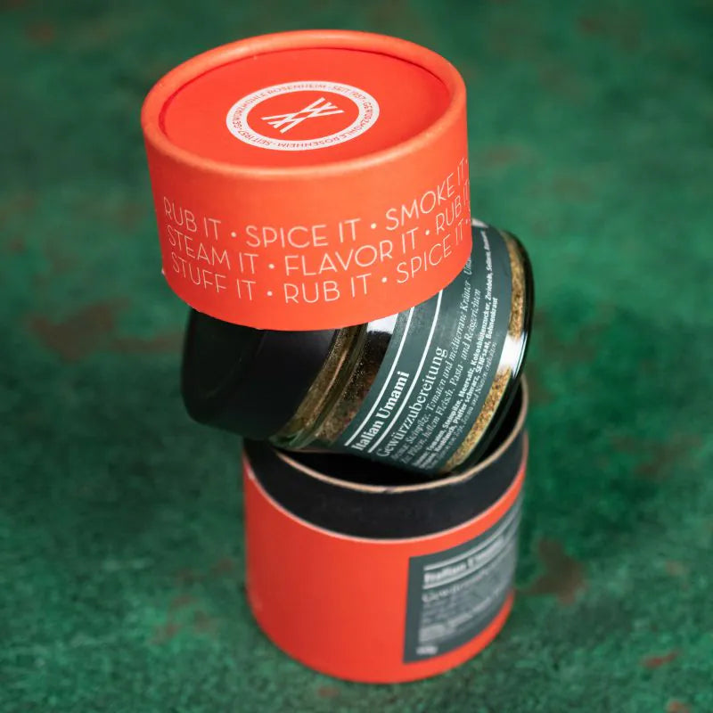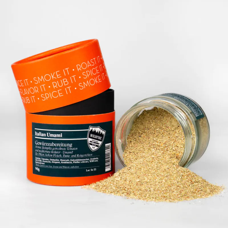 Im Rahmen der Partnerschaft zwischen der Big Green Egg Deutschland GmbH und der Gewürzmühle Rosenheim ist die Wildfire Gewürzedition entstanden, die neben klassischen Rubs, einzigartige Mischungen wie etwa das Wildfire ‚Yuzu Curry‘ oder den Dessertrub ‚Honeyballs‘ umfasst. Natürlich darf in der Wildfire Linie ein mediterraner Klassiker für Fleisch-, Pilz-, Reis- und Pastagerichte nicht fehlen. So entstand die Gewürzzubereitung ‚Italian Umami‘.