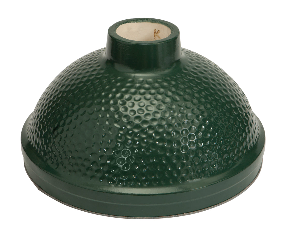Keramikkuppel mit Abluftkamin, die sich mit einem Federmechanismus einfach öffnen und schliessen lässt. Die Keramik ist mit einer Schutzglasur beschichtet. Durch die Isolierung und Rückstrahlung der Keramik im EGG zirkuliert Heissluft, wodurch die Zutaten sehr gleichmässig gegart und besonders aromatisch werden.