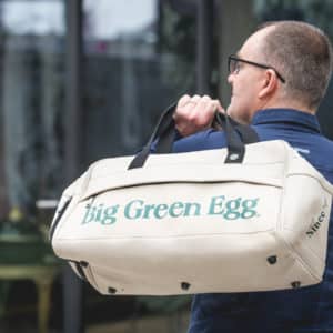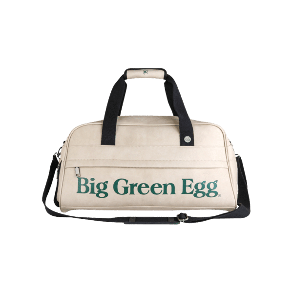 Im Innern der Sporttasche findest du außerdem 3 praktische Fächer für dein Smartphone und andere Kleinigkeiten. Zusätzlich zu den schwarzen, baumwollartig weichen Tragegriffen wird ein langer Baumwollriemen mitgeliefert, sodass du die Tasche auch auf der Schulter transportieren kannst. Die Vorderseite ist mit dem dunkelgrünen Big Green Egg-Logo versehen.