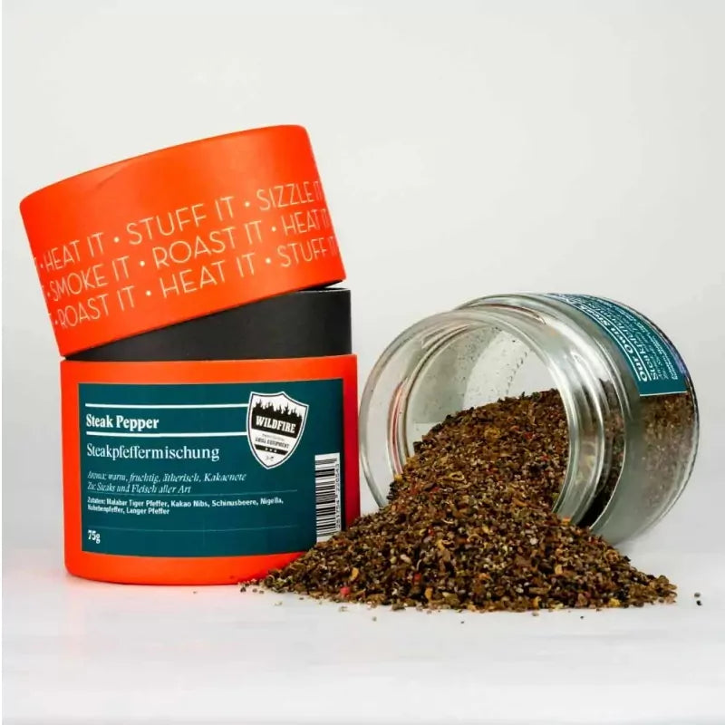 Der speziell für die Big Green Egg Deutschland GmbH entwickelte Steakpfeffer ist ein Feuerwerk der tiefen, warmen Aromen! Er überzeugt mit schokoladig-herben Noten von Kakaobohnen, pfeffriger Schärfe des Malabar Tiger Pfeffer und fruchtigen Aromen der Schinusbeeren. Hinzu kommen ätherischer Kubebenpfeffer und würzig-erdiger, zimtiger langer Pfeffer. Eine ideale Begleitung zu kurzgebratenen Steaks und Wildfleisch. Auch Gemüsegerichte wie zum Beispiel Rotkohl beziehungsweise Blaukraut können mit diesem Pfeffer wunderbar gewürzt werden.